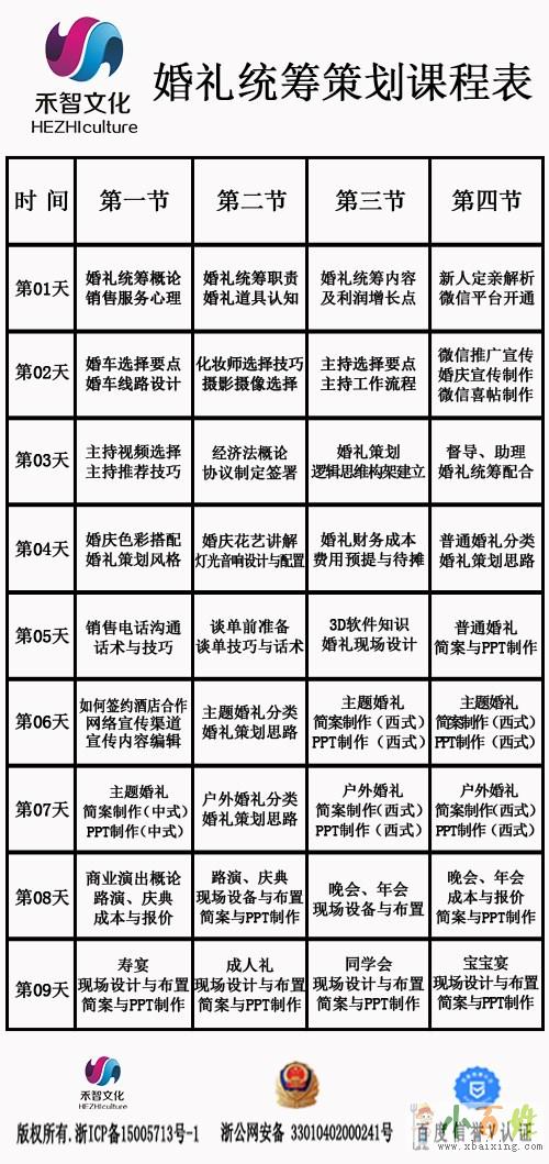 建立客户源等;培训内容:婚礼统筹,婚礼策划(色系与花艺的搭配,新人策划